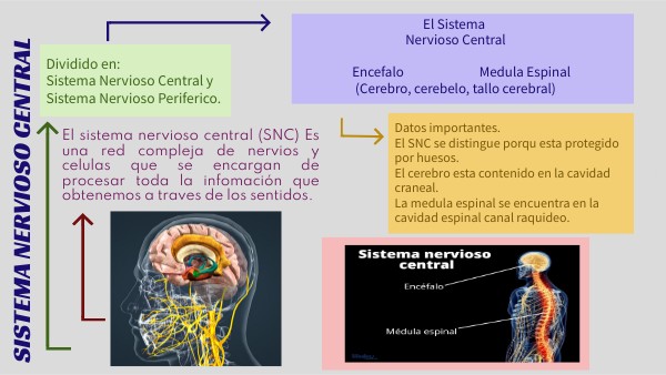 El sistema nervioso central (SNC) Es una red compleja de nervios y celulas que se encargan de procesar toda la infomación que obtenemos a traves de los sentidos.