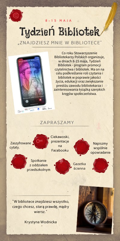 "W bibliotece znajdziesz wszystko, czego chcesz, starą prawdę, mądry wiersz." Krystyna Wodnicka
