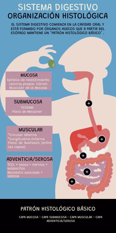 El sistema digestivo comienza en la cavidad oral y está formado por órganos huecos que a partir del esófago mantiene un "patrón histológico básico" .