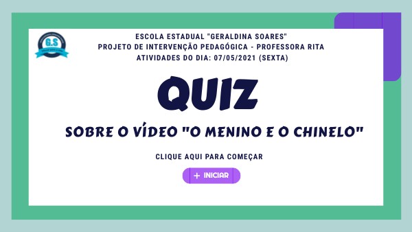 ESCOLA ESTADUAL "GERALDINA SOARES"PROJETO DE INTERVENÇÃO PEDAGÓGICA - PROFESSORA RITA ATIVIDADES DO DIA: 07/05/2021 (SEXTA)