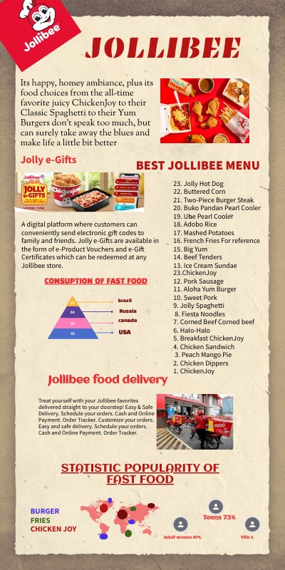 23.ChickenJoy 12. Pork Sausage 11. Aloha Yum Burger 10. Sweet Pork 9. Jolly Spaghetti 8. Fiesta Noodles 7. Corned Beef Corned beef 6. Halo-Halo 5. Breakfast ChickenJoy 4. Chicken Sandwich 3. Peach Mango Pie 2. Chicken Dippers 1. ChickenJoy
