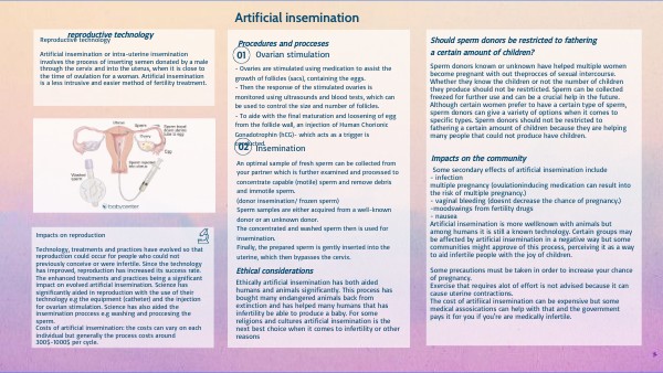 Technology, treatments and practices have evolved so that reproduction could occur for people who could not previously conceive or were infertile. Since the technology has improved, reproduction has increased its success rate. The enhanced treatments and practices being a significant impact on evolved artificial insemination. Science has significantly aided in reproduction with the use of their technology e.g the equipment (catheter) and the injection for ovarian stimulation. Science has also aided the insemination proccess e.g washing and proccesing the sperm.