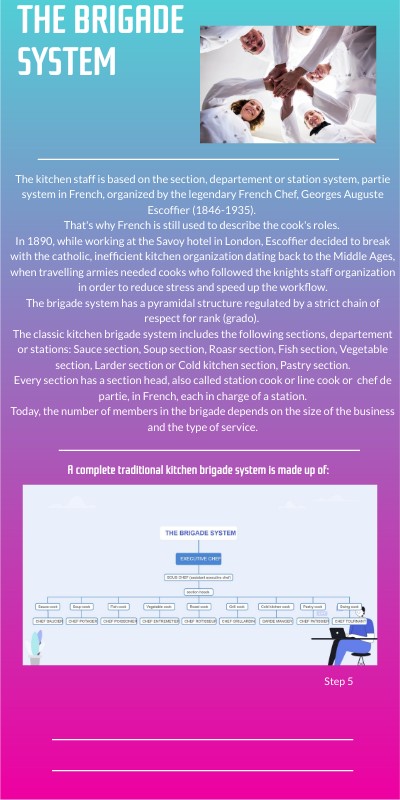 The kitchen staff is based on the section, departement or station system, partie system in French, organized by the legendary French Chef, Georges Auguste Escoffier (1846-1935). That's why French is still used to describe the cook's roles. In 1890, while working at the Savoy hotel in London, Escoffier decided to break with the catholic, inefficient kitchen organization dating back to the Middle Ages, when travelling armies needed cooks who followed the knights staff organization in order to reduce stress and speed up the workflow.The brigade system has a pyramidal structure regulated by a strict chain of respect for rank (grado). The classic kitchen brigade system includes the following sections, departement or stations: Sauce section, Soup section, Roasr section, Fish section, Vegetable section, Larder section or Cold kitchen section, Pastry section. Every section has a section head, also called station cook or line cook or chef de partie, in French, each in charge of a station. Today, the number of members in the brigade depends on the size of the business and the type of service.