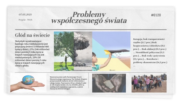 Dzisiejszy świat rozwija się nierównomiernie – różnice w bogactwie pomiędzy krajami stale rosną, ubóstwo dotyka prawie połowę ludzi, prawie co szósty cierpi z powodu niedożywienia. Istnieje kilka przyczyn ubóstwa. Jedną z nich jest przeszłość kolonialna. Europejczycy przez wiele lat bogacili się kosztem krajów ubogich – wykorzystywali ich mieszkańców jako niewolników, eksploatowali surowce naturalne, stworzyli nowe, sztuczne granice państw, które teraz często są przyczyną konfliktów wewnętrznych.