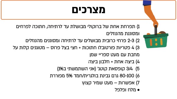 1) תפרחת אחת של ברוקולי מבושלת עד לרתיחה, חתוכה לפרחים ומסוננת מהנוזלים 2) 2-3 פרחי כרובית מבושלים עד לרתיחה ומסוננים מהנוזלים