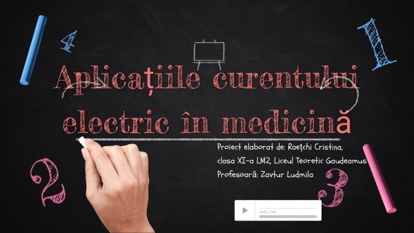 In concluzie, după studierea unui nou domeniu pentru mine, și nume curentul electric în medicină, am deschis ochii către noi metode de tratare a bolilor. Nu aveam idee că există electroterapia, sau cel puțin că există metode de a trata unele boli cu ajutorul curentului electric. Pentru mine acest proiect m-a îndemnat să continui să mă dezvolt și să descopăr noi orizonturi necunoscute mie. Curentul electric, și însăși fizica, au o mare tangență cu lumea înconjurătoare, iar prin proiectul meu, sper că am reușit să aduc informații noi și utile colegilor mei.