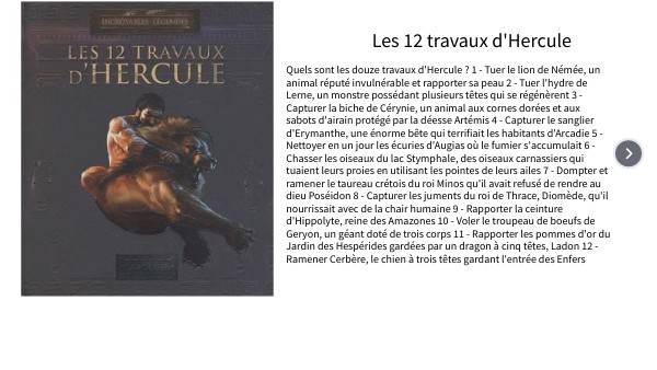 Quels sont les douze travaux d'Hercule ? 1 - Tuer le lion de Némée, un animal réputé invulnérable et rapporter sa peau 2 - Tuer l'hydre de Lerne, un monstre possédant plusieurs têtes qui se régénèrent 3 - Capturer la biche de Cérynie, un animal aux cornes dorées et aux sabots d'airain protégé par la déesse Artémis 4 - Capturer le sanglier d'Erymanthe, une énorme bête qui terrifiait les habitants d'Arcadie 5 - Nettoyer en un jour les écuries d'Augias où le fumier s'accumulait 6 - Chasser les oiseaux du lac Stymphale, des oiseaux carnassiers qui tuaient leurs proies en utilisant les pointes de leurs ailes 7 - Dompter et ramener le taureau crétois du roi Minos qu'il avait refusé de rendre au dieu Poséidon 8 - Capturer les juments du roi de Thrace, Diomède, qu'il nourrissait avec de la chair humaine 9 - Rapporter la ceinture d'Hippolyte, reine des Amazones 10 - Voler le troupeau de boeufs de Geryon, un géant doté de trois corps 11 - Rapporter les pommes d'or du Jardin des Hespérides gardées par un dragon à cinq têtes, Ladon 12 - Ramener Cerbère, le chien à trois têtes gardant l'entrée des Enfers