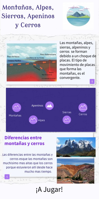 Las montañas, alpes, sierras, apeninos y cerros se forman debido a un choque de placas. El tipo de movimiento de placas que forma las montañas, es el convergente.