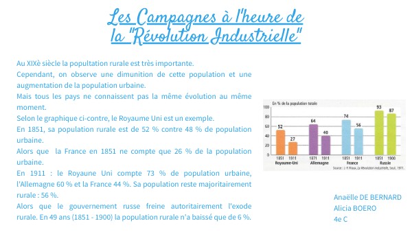 Au XIXè siècle la popultation rurale est très importante. Cependant, on observe une dimunition de cette population et une augmentation de la population urbaine. Mais tous les pays ne connaissent pas la même évolution au même moment. Selon le graphique ci-contre, le Royaume Uni est un exemple. En 1851, sa population rurale est de 52 % contre 48 % de population urbaine. Alors que la France en 1851 ne compte que 26 % de la population urbaine. En 1911 : le Royaune Uni compte 73 % de population urbaine, l'Allemagne 60 % et la France 44 %. Sa population reste majoritairement rurale : 56 %. Alors que le gouvernement russe freine autoritairement l'exode rurale. En 49 ans (1851 - 1900) la population rurale n'a baissé que de 6 %.