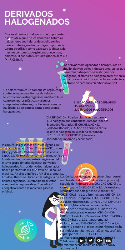 Los derivados halogenados o halogenuros de alquilo, derivan de los hidrocarburos, en los que uno o más hidrógenos se sustituyen por halógenos, el átomo de halógeno presente en la estructura está unido por un enlace covalente a un átomo de carbono con hibridación sp3
