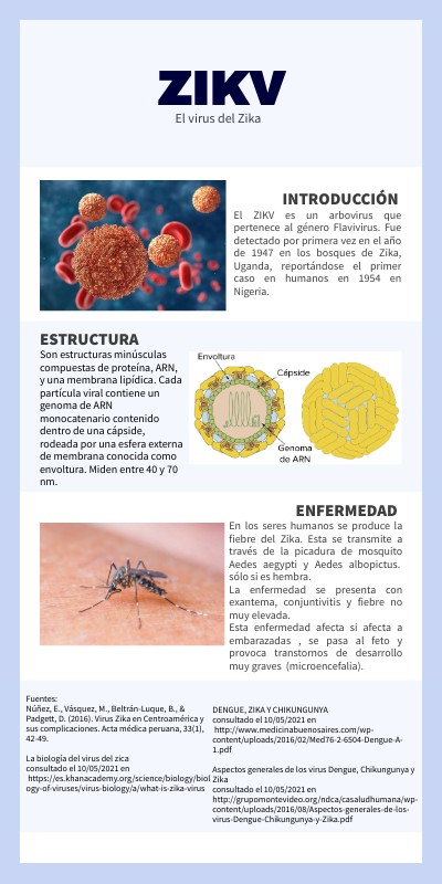 Fuentes: Núñez, E., Vásquez, M., Beltrán-Luque, B., & Padgett, D. (2016). Virus Zika en Centroamérica y sus complicaciones. Acta médica peruana, 33(1), 42-49. La biología del virus del zica consultado el 10/05/2021 en https://es.khanacademy.org/science/biology/biology-of-viruses/virus-biology/a/what-is-zika-virus
