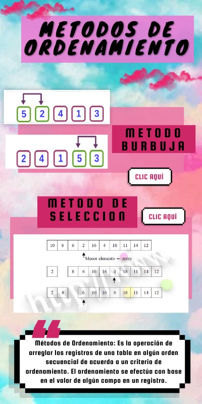 Métodos de Ordenamiento: Es la operación de arreglar los registros de una tabla en algún orden secuencial de acuerdo a un criterio de ordenamiento. El ordenamiento se efectúa con base en el valor de algún campo en un registro.