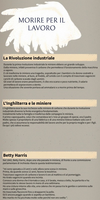 Durante la prima rivoluzione industriale le miniere ebbero un grande sviluppo.Dalla miniera, infatti proveniva il carbone che permetteva il funzionamento della macchina a vapore. E ciò trasforma le miniere una tragedia, soprattutto per i bambini e le donne costretti a lavorare nelle miniere, al buio, al freddo, all'umido con il compito di trascinare vagoncini carichi di carbone scavato dagli uomini. Gli orari di lavoro erano pesantissimi, il cibo era scarso e poco nutriente, il salario permetteva di sopravvivere a stento. Una situazione che sovente portava ad ammalarsi e a morire prima del tempo.