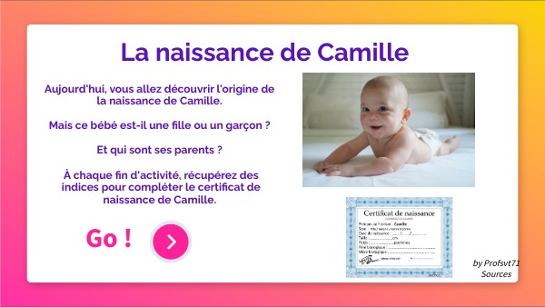 À chaque fin d'activité, récupérez des indices pour compléter le certificat de naissance de Camille.