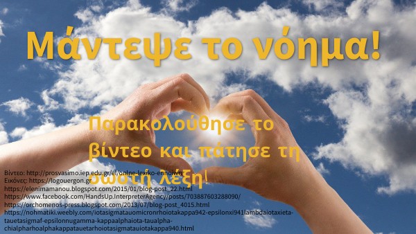 Βίντεο: http://prosvasimo.iep.edu.gr/el/onlne-lexiko-ennoiwn Εικόνες: https://logouergon.gr https://elenimamanou.blogspot.com/2015/01/blog-post_22.html https://www.facebook.com/HandsUp.InterpreterAgency/posts/703887603288090/ https://orchomenos-press.blogspot.com/2013/07/blog-post_4015.html https://nohmatiki.weebly.com/iotasigmatauomicronrhoiotakappa942-epsilonxi941lambdaiotaxieta-tauetasigmaf-epsilonnugamma-kappaalphaiota-taualpha-chialpharhoalphakappatauetarhoiotasigmatauiotakappa940.html