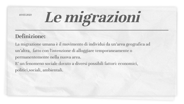 La migrazione umana è il movimento di individui da un’area geografica ad un’altra, fatto con l'intenzione di alloggiare temporaneamente o permanentemente nella nuova area. E’ un fenomeno sociale dovuto a diversi possibili fattori: economici, politici,sociali, ambientali.