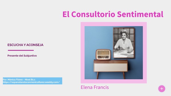 ESCUCHA algunas consultas que ha recibido la doctora del corazón Elena Francis en su programa Consultorio sentimental y de belleza, al aire entre 1947 y 1975 en España. Luego: 1. COMPLETA el texto que falta. 2. ESCRIBE 3 consejos para cada caso, usando el Subjuntivo. 3. ESCUCHA lo consejos que da la doctora Francis. 4. ELIGE y EXPRESA tu opinión sobre los consejos dados.