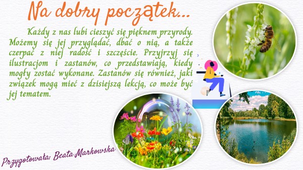 Każdy z nas lubi cieszyć się pięknem przyrody. Możemy się jej przyglądać, dbać o nią, a także czerpać z niej radość i szczęście. Przyjrzyj się ilustracjom i zastanów, co przedstawiają, kiedy mogły zostać wykonane. Zastanów się również, jaki związek mogą mieć z dzisiejszą lekcją, co może być jej tematem.