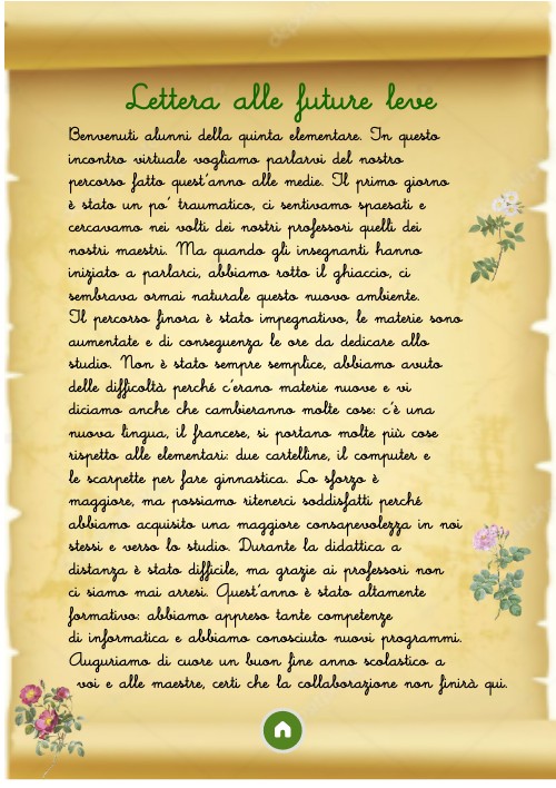Benvenuti alunni della quinta elementare. In questo incontro virtuale vogliamo parlarvi del nostro percorso fatto quest’anno alle medie. Il primo giorno è stato un po’ traumatico, ci sentivamo spaesati e cercavamo nei volti dei nostri professori quelli dei nostri maestri. Ma quando gli insegnanti hanno iniziato a parlarci, abbiamo rotto il ghiaccio, ci sembrava ormai naturale questo nuovo ambiente. Il percorso finora è stato impegnativo, le materie sono aumentate e di conseguenza le ore da dedicare allo studio. Non è stato sempre semplice, abbiamo avuto delle difficoltà perché c’erano materie nuove e vi diciamo anche che cambieranno molte cose: c’è una nuova lingua, il francese, si portano molte più cose rispetto alle elementari: due cartelline, il computer e le scarpette per fare ginnastica. Lo sforzo è maggiore, ma possiamo ritenerci soddisfatti perché abbiamo acquisito una maggiore consapevolezza in noi stessi e verso lo studio. Durante la didattica a distanza è stato difficile, ma grazie ai professori non ci siamo mai arresi. Quest’anno è stato altamente formativo: abbiamo appreso tante competenze di informatica e abbiamo conosciuto nuovi programmi. Auguriamo di cuore un buon fine anno scolastico a voi e alle maestre, certi che la collaborazione non finirà qui.