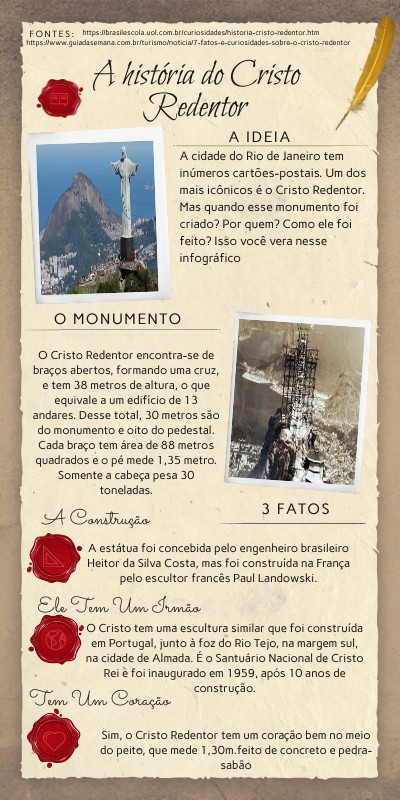 A cidade do Rio de Janeiro tem inúmeros cartões-postais. Um dos mais icônicos é o Cristo Redentor. Mas quando esse monumento foi criado? Por quem? Como ele foi feito? Isso você vera nesse infográfico