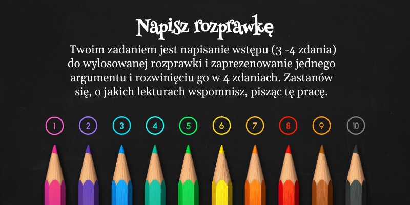 Twoim zadaniem jest napisanie wstępu (3 -4 zdania) do wylosowanej rozprawki i zaprezenowanie jednego argumentu i rozwinięciu go w 4 zdaniach. Zastanów się, o jakich lekturach wspomnisz, pisząc tę pracę.