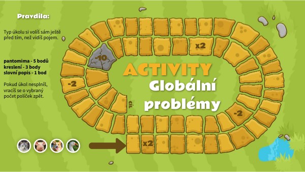 Typ úkolu si volíš sám ještě před tím, než vidíš pojem. pantomima - 5 bodů kreslení - 3 body slovní popis - 1 bod Pokud úkol nesplníš, vracíš se o vybraný počet políček zpět.
