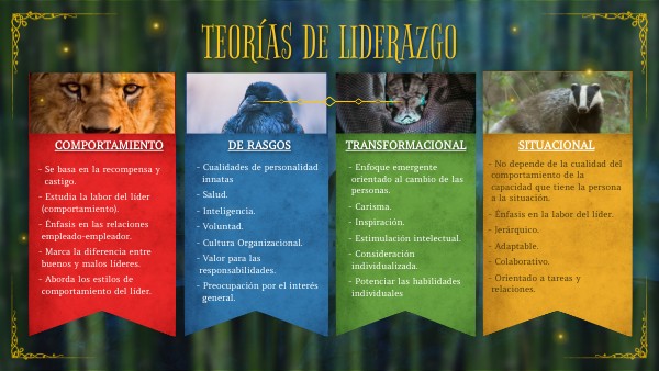 - Se basa en la recompensa y castigo. - Estudia la labor del líder (comportamiento). - Énfasis en las relaciones empleado-empleador. - Marca la diferencia entre buenos y malos líderes. - Aborda los estilos de comportamiento del líder.