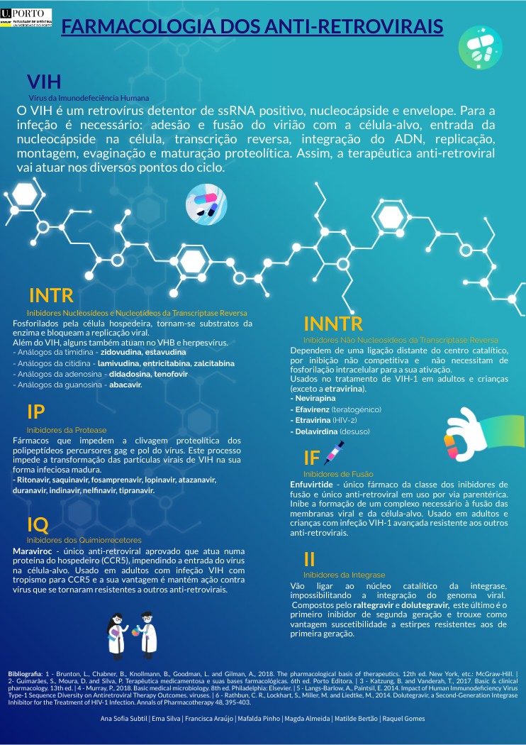 Bibliografia: 1 - Brunton, L., Chabner, B., Knollmann, B., Goodman, L. and Gilman, A., 2018. The pharmacological basis of therapeutics. 12th ed. New York, etc.: McGraw-Hill. | 2- Guimarães, S., Moura, D. and Silva, P. Terapêutica medicamentosa e suas bases farmacológicas. 6th ed. Porto Editora. | 3 - Katzung, B. and Vanderah, T., 2017. Basic & clinical pharmacology. 13th ed. | 4 - Murray, P., 2018. Basic medical microbiology. 8th ed. Philadelphia: Elsevier. | 5 - Langs-Barlow, A., Paintsil, E. 2014. Impact of Human Immunodeficiency Virus Type-1 Sequence Diversity on Antiretroviral Therapy Outcomes. viruses. | 6 - Rathbun, C. R., Lockhart, S., Miller, M. and Liedtke, M., 2014. Dolutegravir, a Second-Generation Integrase Inhibitor for the Treatment of HIV-1 Infection. Annals of Pharmacotherapy 48, 395-403.