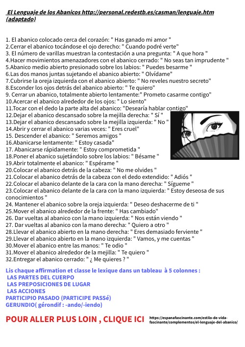 El Lenguaje de los Abanicos http://personal.redestb.es/casman/lenguaje.htm (adaptado) 1. El abanico colocado cerca del corazón: " Has ganado mi amor " 2.Cerrar el abanico tocándose el ojo derecho: " Cuando podré verte" 3. El número de varillas muestran la contestación a una pregunta: " A que hora " 4.Hacer movimientos amenazadores con el abanico cerrado: " No seas tan imprudente " 5.Abanico medio abierto presionado sobre los labios: " Puedes besarme " 6.Las dos manos juntas sujetando el abanico abierto: " Olvídame" 7.Cubrirse la oreja izquierda con el abanico abierto: " No reveles nuestro secreto" 8.Esconder los ojos detrás del abanico abierto: " Te quiero" 9. Cerrar un abanico, totalmente abierto lentamente:" Prometo casarme contigo" 10.Acercar el abanico alrededor de los ojos: " Lo siento" 11.Tocar con el dedo la parte alta del abanico: "Desearía hablar contigo" 12.Dejar el abanico descansado sobre la mejilla derecha: " Sí " 13.Dejar el abanico descansado sobre la mejilla izquierda: " No " 14.Abrir y cerrar el abanico varias veces: " Eres cruel" 15. Descender el abanico: " Seremos amigos " 16.Abanicarse lentamente: " Estoy casada" 17. Abanicarse rápidamente: " Estoy comprometida " 18.Poner el abanico sujetándolo sobre los labios: " Bésame " 19.Abrir totalmente el abanico: " Espérame " 20.Colocar el abanico detrás de la cabeza: " No me olvides " 21.Colocar el abanico detrás de la cabeza con el dedo extendido: " Adiós " 22.Colocar el abanico delante de la cara con la mano derecha: " Sígueme " 23.Colocar el abanico delante de la cara con la mano izquierda: " Estoy deseosa de sus conocimientos " 24. Mantener el abanico sobre la oreja izquierda: " Deseo deshacerme de ti " 25.Mover el abanico alrededor de la frente: " Has cambiado" 26. Dar vueltas al abanico con la mano izquierda: " Nos están viendo " 27. Dar vueltas al abanico con la mano derecha: " Quiero a otro " 28.Llevar el abanico abierto en la mano derecha: " Eres demasiado ferviente " 29.Llevar el abanico abierto en la mano izquierda: " Vamos, y me cuentas " 30.Mover el abanico entre las manos: " Te odio " 31.Mover el abanico alrededor de la mejilla: " Te quiero " 32.Entregar el abanico cerrado: " ¿ Me quieres ? "