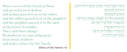 Moses received the Torah at Sinai and passed it on to Joshua and Joshua passed it on to the elders and the elders passed it on to the prophets and the prophets passed it to the men of the Great Assembly. They said three things: Be moderate in your judgement, train many students and make a fence for the Torah.