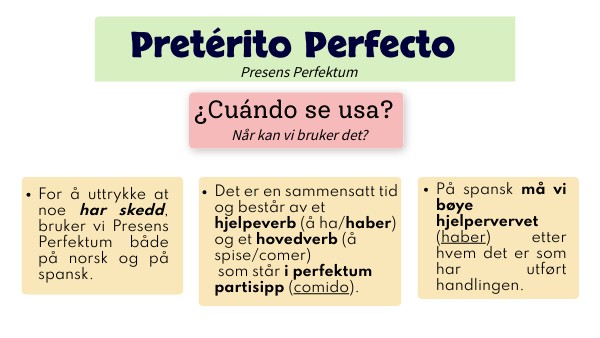 - For å uttrykke at noe har skedd, bruker vi Presens Perfektum både på norsk og på spansk.