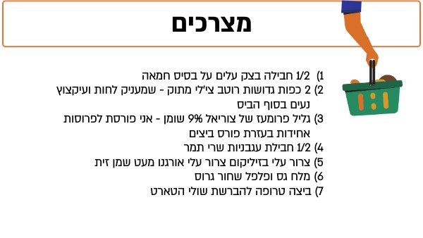 1) 1/2 חבילה בצק עלים על בסיס חמאה 2) 2 כפות גדושות רוטב צי'לי מתוק - שמעניק לחות ועיקצוץ נעים בסוף הביס 3) גליל פרומעז של צוריאל 9% שומן - אני פורסת לפרוסות אחידות בעזרת פורס ביצים 4) 1/2 חבילת עגבניות שרי תמר 5) צרור עלי בזיליקום צרור עלי אורגנו מעט שמן זית 6) מלח גס ופלפל שחור גרוס 7) ביצה טרופה להברשת שולי הטארט