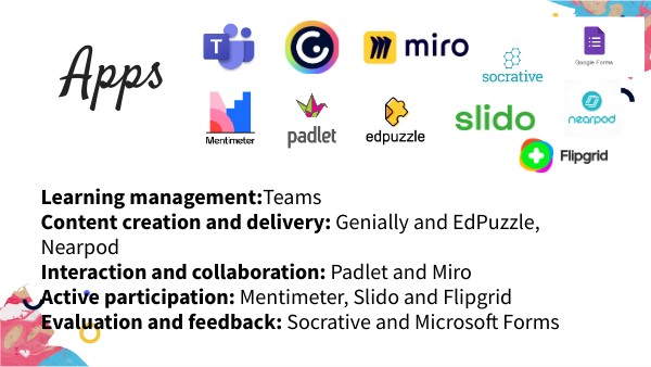 Learning management:Teams Content creation and delivery: Genially and EdPuzzle, Nearpod Interaction and collaboration: Padlet and Miro Active participation: Mentimeter, Slido and Flipgrid Evaluation and feedback: Socrative and Microsoft Forms