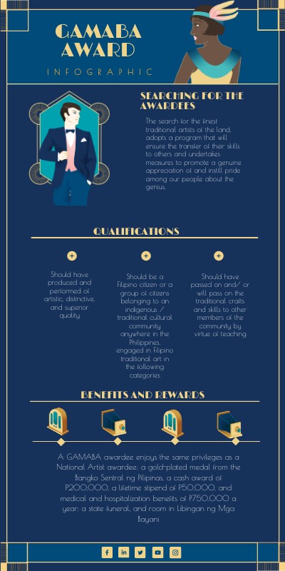 A GAMABA awardee enjoys the same privileges as a National Artist awardee: a gold-plated medal from the Bangko Sentral ng Pilipinas, a cash award of P200,000, a lifetime stipend of P50,000, and medical and hospitalization benefits of P750,000 a year; a state funeral, and room in Libingan ng Mga Bayani