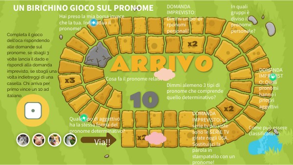 Completa il gioco dell'oca rispondendo alle domande sul pronome, se sbagli 3 volte lancia il dado e rispondi alla domanda imprevisto, se sbagli una volta indietreggi di una casella. Chi arriva per primo vince un 10 ad italiano.