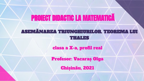 Disciplina: Matematica Clasa: a X-a, profil real Modulul: Figuri geometrice în plan Subiectul lecției: Asemănarea triunghiurilor. Teorema lui Thales Durata lecţiei: 80 min Tipul lecției: mixtă Modalitatea de organizare a lecției: online