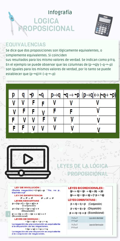 Se dice que dos proposiciones son lógicamente equivalentes, o simplemente equivalentes. Si coinciden sus resultados para los mismo valores de verdad. Se indican como p≡q. En el ejemplo se puede observar que las columnas de (p→q)y (~q→~p) son iguales para los mismos valores de verdad, por lo tanto se puede establecer que (p→q)≡ (~q→~p)