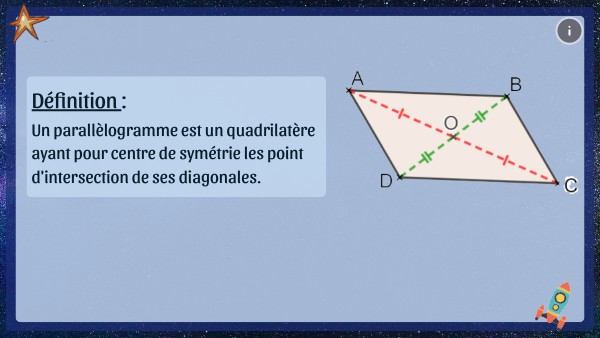 Un parallèlogramme est un quadrilatère ayant pour centre de symétrie les point d'intersection de ses diagonales.