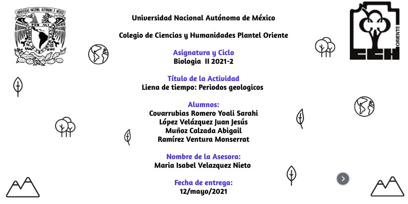 Universidad Nacional Autónoma de México Colegio de Ciencias y Humanidades Plantel Oriente Asignatura y Ciclo Biologia II 2021-2 Título de la Actividad Liena de tiempo: Periodos geologicos Alumnos: Covarrubias Romero Yoali Sarahi López Velázquez Juan Jesús Muñoz Calzada Abigail Ramírez Ventura Monserrat Nombre de la Asesora: Maria Isabel Velazquez Nieto Fecha de entrega: 12/mayo/2021