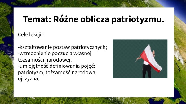 Cele lekcji: -kształtowanie postaw patriotycznych; -wzmocnienie poczucia własnej tożsamości narodowej; -umiejętność definiowania pojęć: patriotyzm, tożsamość narodowa, ojczyzna.