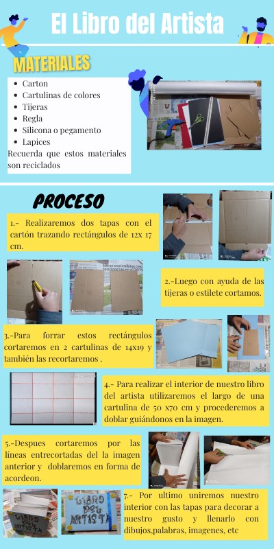 4.- Para realizar el interior de nuestro libro del artista utilizaremos el largo de una cartulina de 50 x70 cm y procederemos a doblar guiándonos en la imagen.
