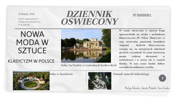 Król Stanisław August Poniatowski jest mecenasem sztuki. Sprowadza do Polski wielu zagranicznych twórców sztuki i daje pieniądze znanym artystom. Władca polski zakłada w Warszawie (stolicy Polski) teatr narodowy, a także przebudowano zespół pałacowo-parkowy w Łazienkach na polecenie Monarchy. Stanisław August Poniatowski jest zwolennikiem reformy państwa, którą chce przeprowadzić przy poparciu Rosji. Każdy wie że jest wielkim miłośnikiem i mecenasem kultury, sztuki oraz edukacji.