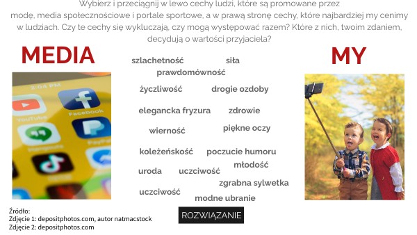 Wybierz i przeciągnij w lewo cechy ludzi, które są promowane przezmodę, media społecznościowe i portale sportowe, a w prawą stronę cechy, które najbardziej my cenimy w ludziach. Czy te cechy się wykluczają, czy mogą występować razem? Które z nich, twoim zdaniem, decydują o wartości przyjaciela?