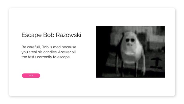 Be carefull, Bob is mad because you steal his candies. Answer all the tests correctly to escape