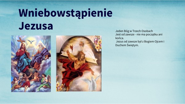 Jeden Bóg w Trzech Osobach Jest od zawsze - nie ma początku ani końca. Jezus od zawsze był z Bogiem Ojcem i Duchem Świętym.