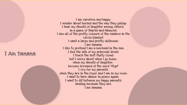 I am carefree and happy. I wonder about horses and the way they gallup. I hear my shouts of laughter among others, in a game of Sharks and Minnows. I see all of the pretty colours of the rainbow in the circle blanket. I want a large and pretty dollhouse. I am Banana. I like to pretend I am a mermaid in the sea. I feel the silk of my princess dress. I touch the soft fluffy cloud. But I worry about when I go home, when my shouts of laughter, become screams of the word "Stop!" I cry for my parents, when they are in the foyer and I am in my room. I want to have dinner in peace again. I want to sit between my happy parents, smiling because they are. I am Banana.