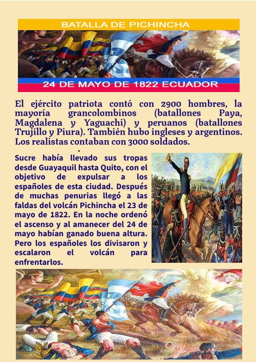 Sucre había llevado sus tropas desde Guayaquil hasta Quito, con el objetivo de expulsar a los españoles de esta ciudad. Después de muchas penurias llegó a las faldas del volcán Pichincha el 23 de mayo de 1822. En la noche ordenó el ascenso y al amanecer del 24 de mayo habían ganado buena altura. Pero los españoles los divisaron y escalaron el volcán para enfrentarlos.