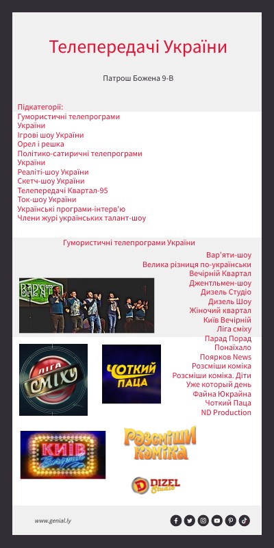 Вар'яти-шоу Велика різниця по-українськи Вечірній Квартал Джентльмен-шоу Дизель Студіо Дизель Шоу Жіночий квартал Київ Вечірній Ліга сміху Парад Порад Понаїхало Поярков News Розсміши коміка Розсміши коміка. Діти Уже который день Файна Юкрайна Чоткий Паца ND Production