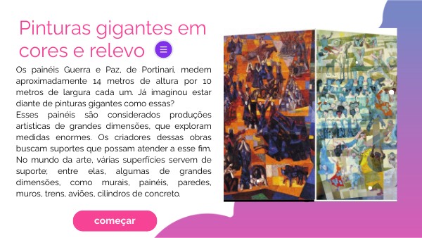 Os painéis Guerra e Paz, de Portinari, medem aproximadamente 14 metros de altura por 10 metros de largura cada um. Já imaginou estar diante de pinturas gigantes como essas? Esses painéis são considerados produções artísticas de grandes dimensões, que exploram medidas enormes. Os criadores dessas obras buscam suportes que possam atender a esse fim. No mundo da arte, várias superfícies servem de suporte; entre elas, algumas de grandes dimensões, como murais, painéis, paredes, muros, trens, aviões, cilindros de concreto.