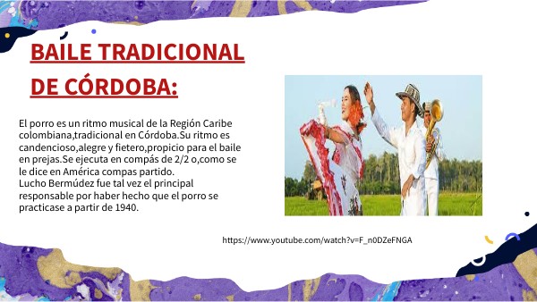 El porro es un ritmo musical de la Región Caribe colombiana,tradicional en Córdoba.Su ritmo es candencioso,alegre y fietero,propicio para el baile en prejas.Se ejecuta en compás de 2/2 o,como se le dice en América compas partido.Lucho Bermúdez fue tal vez el principal responsable por haber hecho que el porro se practicase a partir de 1940.